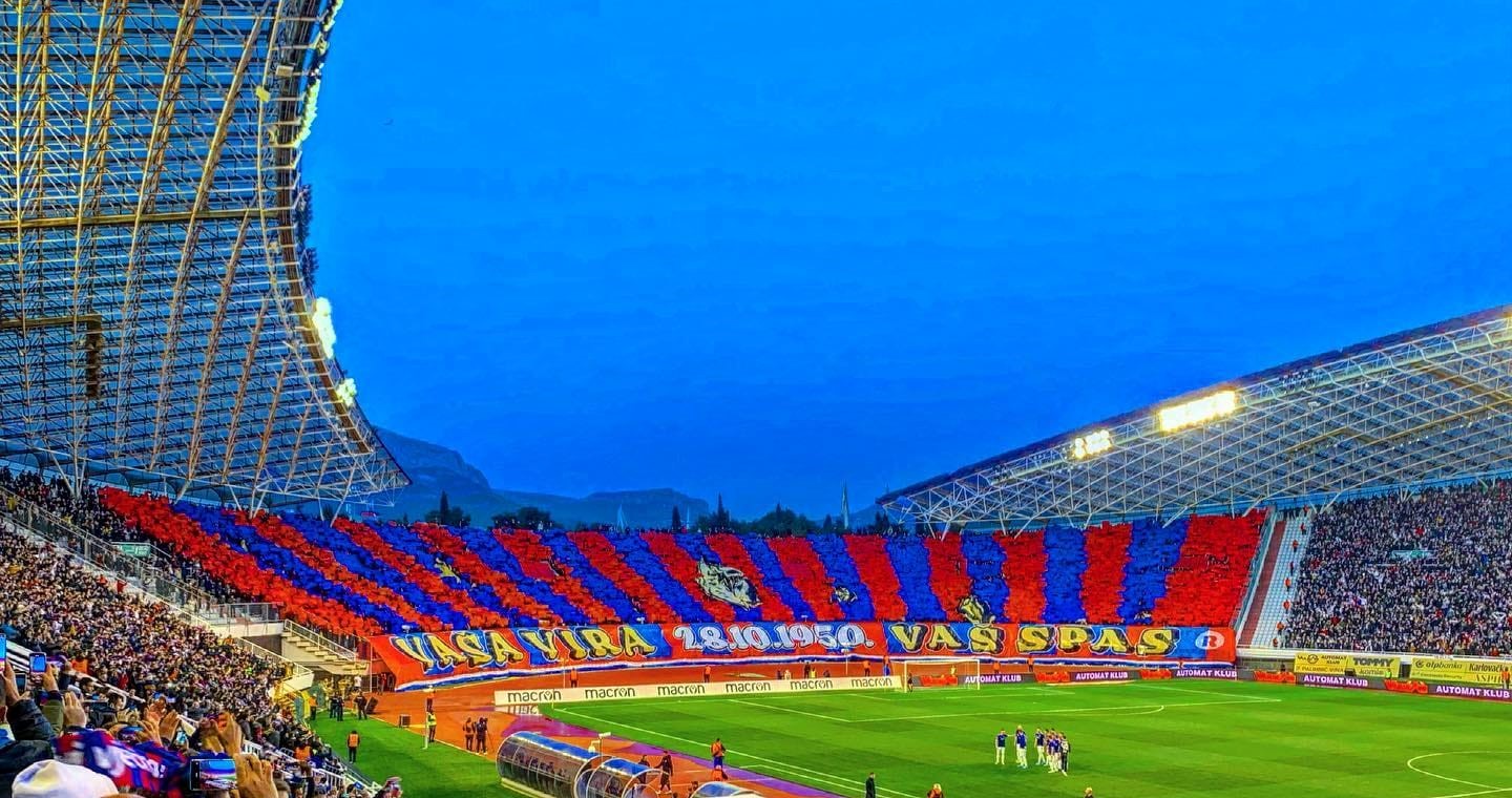 Tifo représentant un bateau en mer. Le bateau est le club de Split et les drapeaux au dessus sont chacun une lettre du code de navigation maritime internationnal.