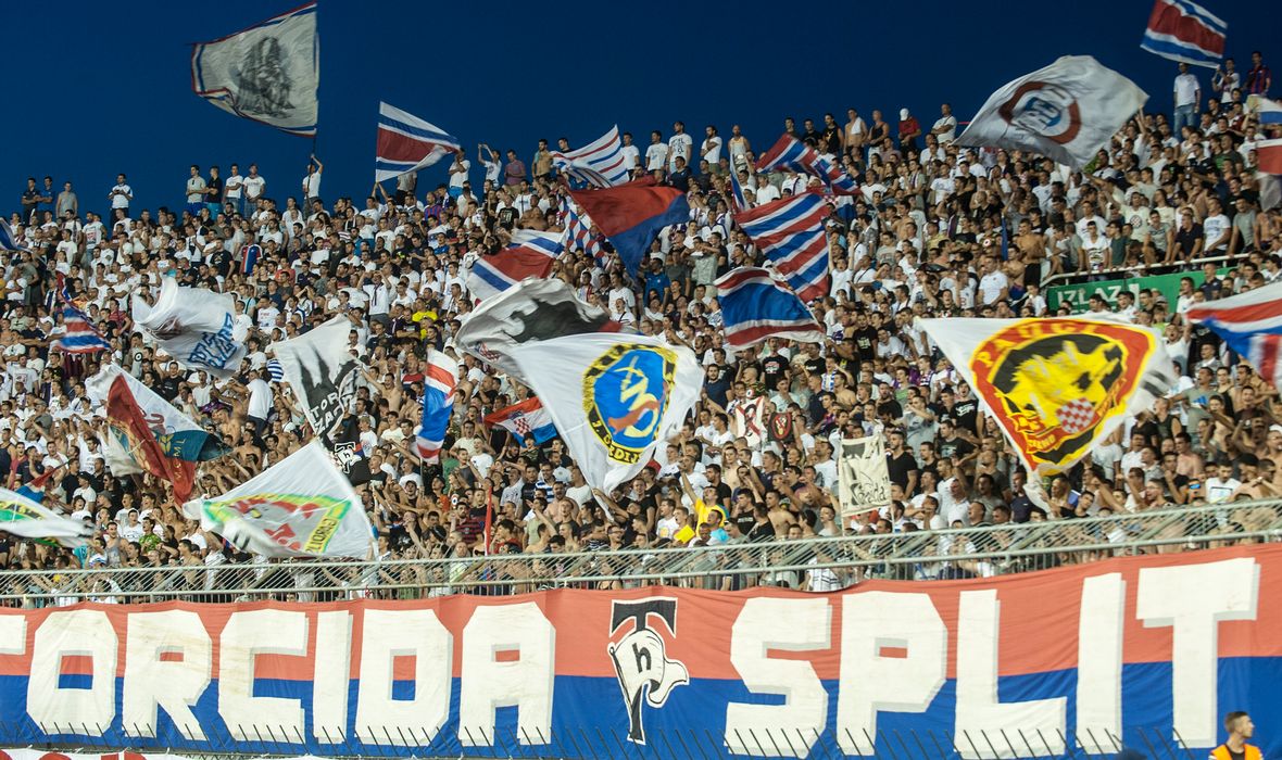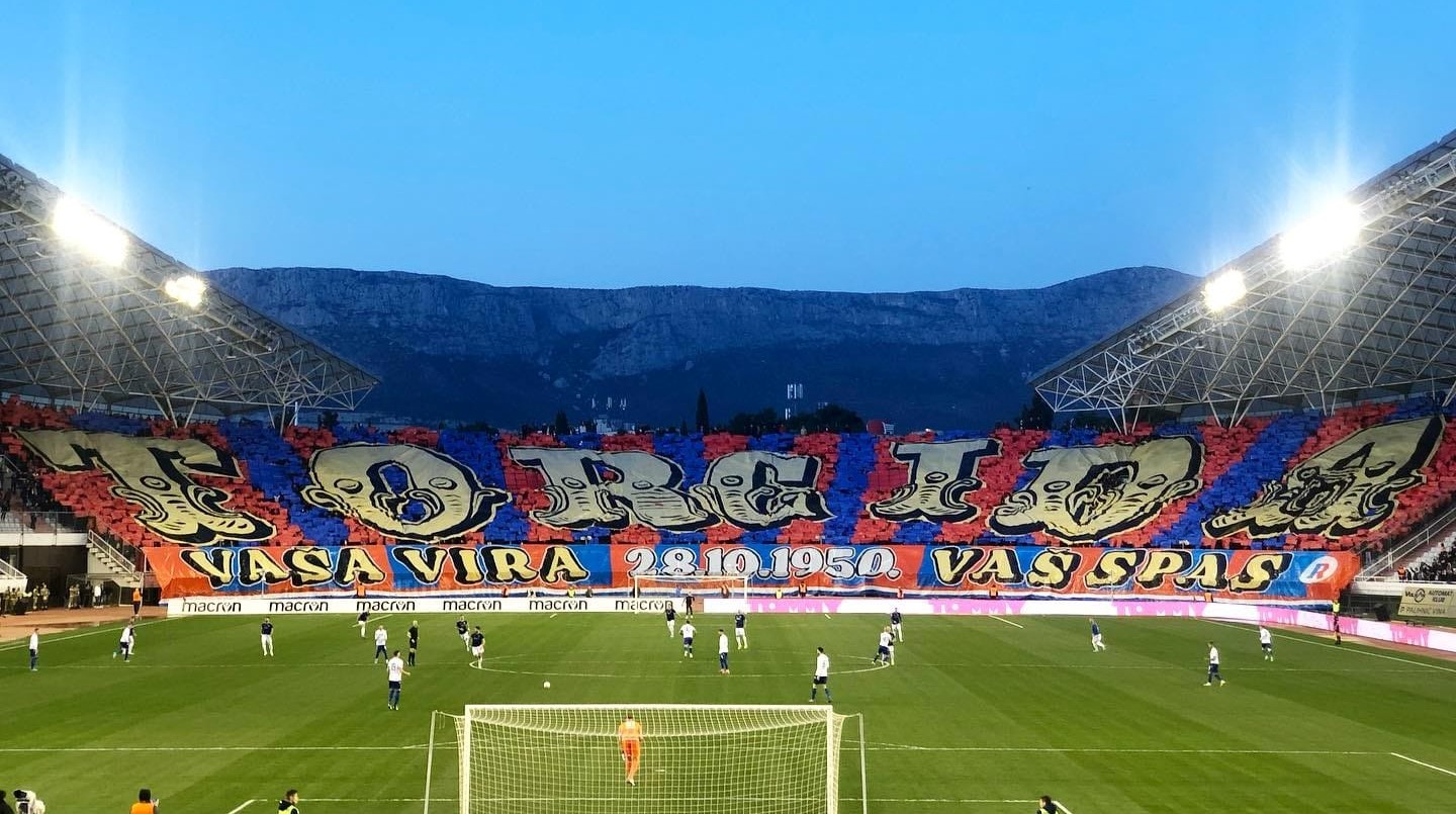 Tifo représentant un bateau en mer. Le bateau est le club de Split et les drapeaux au dessus sont chacun une lettre du code de navigation maritime internationnal.